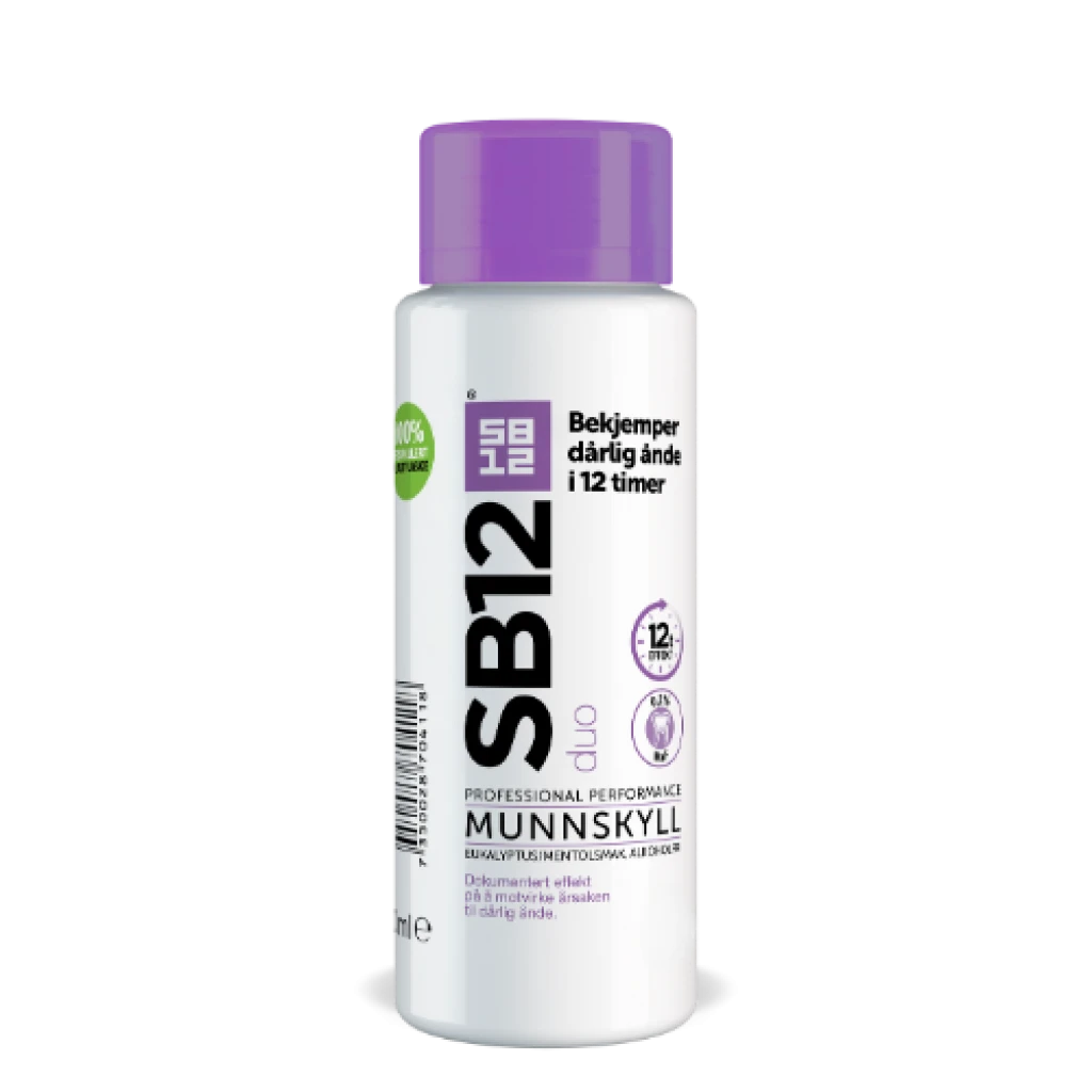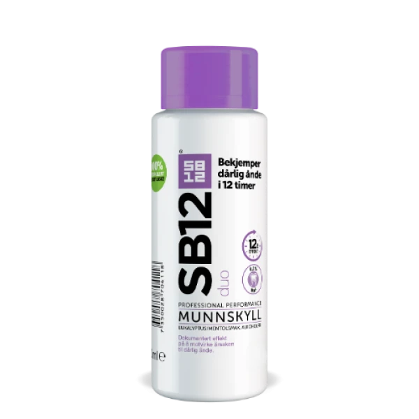 - Frisk eukalyptus-/mentolsmak: SB12 Munnskyll Duo gir en behagelig, frisk eukalyptus-/mentolsmak, som bidrar til langvarig frisk pust.